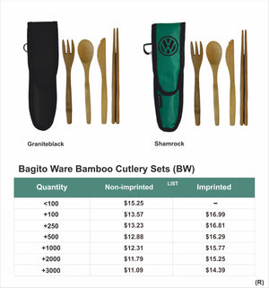 A premium reusable cutlery set made from 100% natural and non-coated bamboo. Super smooth and full sized, the set includes: fork, spoon, knife and chopsticks in a durable rPet fabric pouch with velcro closure, and carabiner. The pouch is breathable to help inhibit bacteria. Custom imprinting available. (Screen printing on pouch, laser engraving on individual utensils).