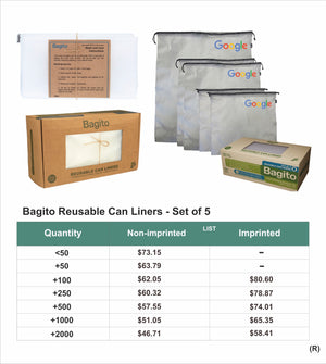 Available in sets of 5 – 2 small (bathroom and bedroom), 2 medium (kitchen, office), 1 large (yard and leaf). Also available in XL commercial size (65 gal. 47” x 50”). Custom imprinting available.