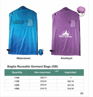 Say goodbye to single-use plastic film with this reusable garment bag and clothing protector, which also doubles as a laundry bag! Folds into small stuff pouch when not in use for easy storage. Made from 100% recycled plastic with a premium rPet fabric. Protects up to 15 garments, eliminating 100 cubic feet of plastic film. Equipped with a peep-hole to see inside, zipper for easy access to garments and pocket for ID tags and invoices. Custom imprinting available on garment bag and stuff pouch.
