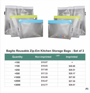 Made from our 100% PEVA material – BPA free, non-chlorinated and tested food safe. Uniquely designed with an extra-wide gusset at the bottom, allowing the bags to stand, load, clean and dry with ease. Extra-strong leak-proof zip seal. Utilizing a double seam sealing technique and using extra thick walls – all to ensure that these bags can be reused hundreds of times. Available in sets of 3 (1 small, 1 medium, and 1 large) and individually. Custom imprinting available (max size 2” x 4”).